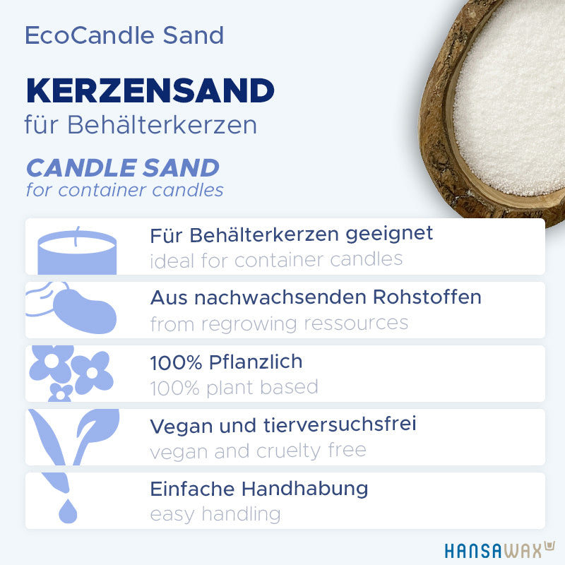 With "EcoCandle Sand" candle sand you can make candles very quickly and in no time at all. All you have to do is pour the wax into a suitable candle container, insert a wick and you're done!