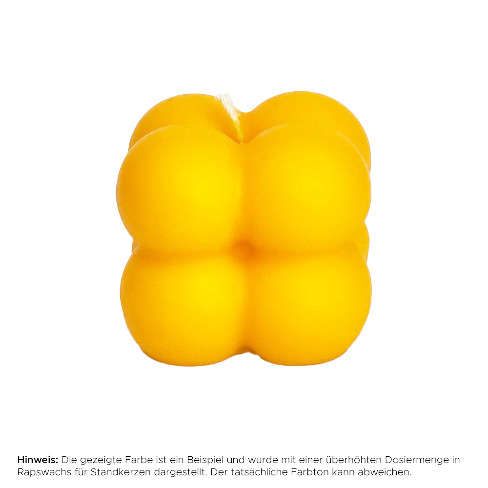 Für "Gelb" wird eine Zugabe von 0,1g (0,01%) für eine niedrige-, 0,2g (0,02%) für eine mittelere- und 0,4g (0,04%) für eine hohe Farbintensität auf 1000g Kerzenwachs empfohlen.