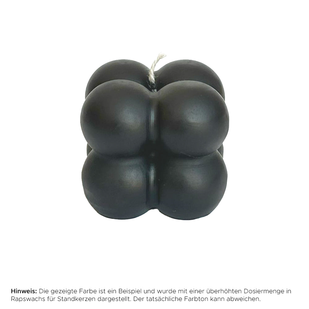 Für "Schwarz" wird eine Zugabe von 0,4g (0,04%) für eine niedrige-, 1,0g (0,1%) für eine mittelere- und 3,0g (0,3%) für eine hohe Farbintensität auf 1000g Kerzenwachs empfohlen.